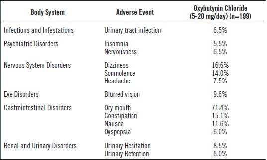 In addition, the following adverse events were reported by 1 to < 5% of patients using oxybutynin chloride (5 to 20 mg/day) in all studies. Infections and Infestations: nasopharyngitis, upper respiratory tract infection, bronchitis, cystitis, fungal infection; Metabolism and Nutrition Disorders: fluid retention; Psychiatric Disorders: confusional state; Nervous System Disorders: dysgeusia, sinus headache; Eye Disorders: keratoconjunctivitis sicca, eye irritation; Cardiac Disorders: palpitations, sinus arrhythmia; Vascular Disorders: flushing; Respiratory, Thoracic andMediastinal Disorders: nasal dryness, cough, pharyngolaryngeal pain, dry throat, sinus congestion, hoarseness, asthma, nasal congestion; Gastrointestinal Disorders: diarrhea, abdominal pain, loose stools, flatulence, vomiting, abdominal pain upper, dysphagia, aptyalism, eructation, tongue coated; Skin and Subcutaneous Tissue Disorders: dry skin, pruritis; Musculoskeletal and Connective Tissue Disorders: back pain, arthralgia, pain in extremity, flank pain; Renal and Urinary Disorders: dysuria, pollakiuria; General Disorders and Administration Site Conditions: fatigue, edema peripheral, asthenia, pain, thirst, edema; Investigations: blood pressure increased, blood glucose increased, blood pressure decreased; Injury, Poisoning, and Procedural Complications: fall.