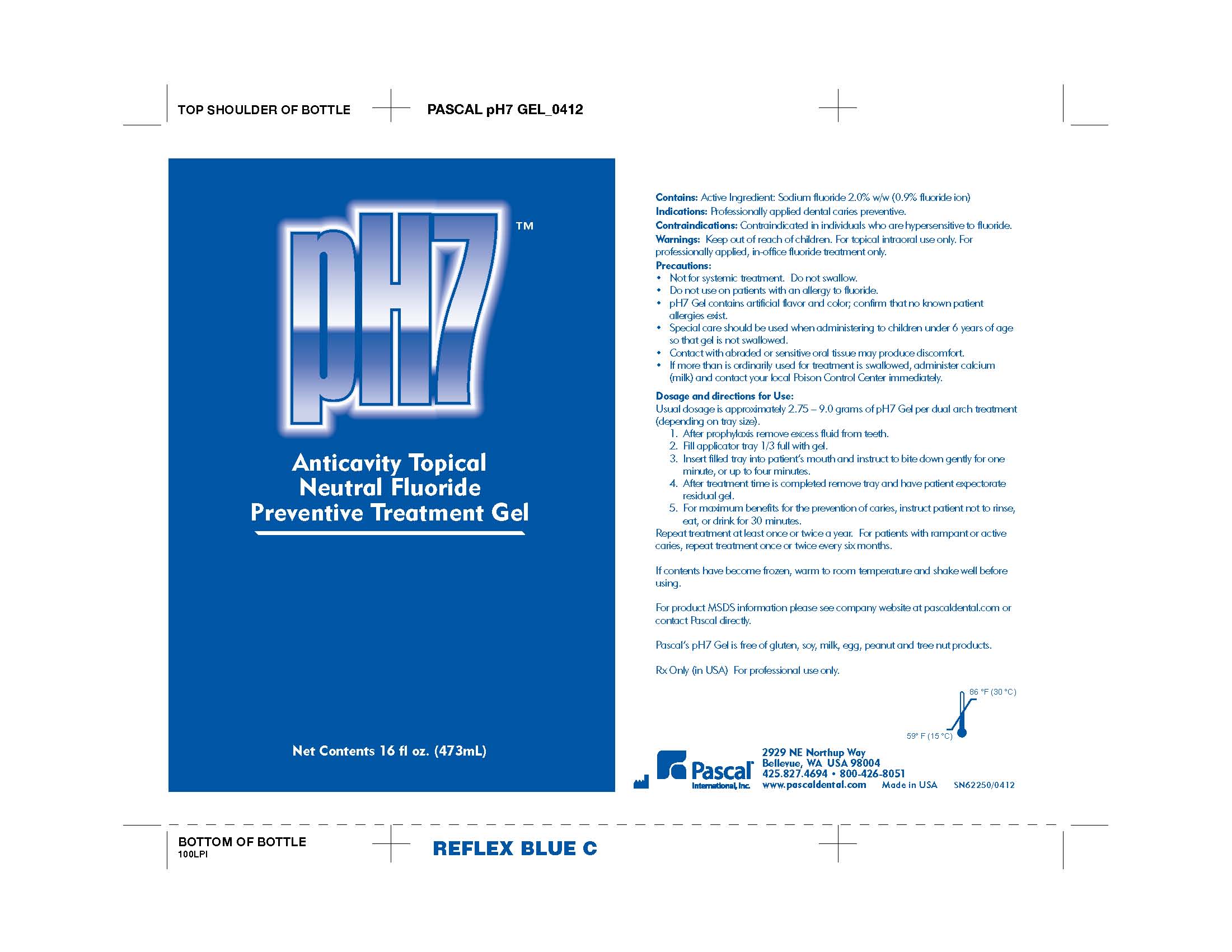 This is a description of a fluoride gel named "Pascal pH7 Gel". It is a professionally applied dental care product that contains 2.0% of sodium fluoride which helps to prevent dental caries. However, it is contraindicated for those who are hypersensitive to fluoride. The user needs to be careful while administering it to children under 6 years of age to avoid accidental swallowing. The dosage of the pH7 Gel is approximately 2.75 - 9.0 grams per dual arch treatment, depending on the tray's size. It should not be swallowed but expectorated after use. The description also provides guidance on the precautions and contraindications for the product.*