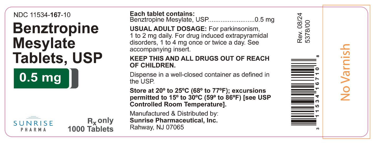 This text provides information about Benztropine Mesylate Tablets, USP with a strength of 0.5 mg in a package containing 100 tablets. It includes details on the usual adult dosage for parkinsonism and drug-induced extrapyramidal disorders. The brand is manufactured and distributed by Sunrise Pharmaceutical, Inc. located in Rahway, NJ. It also gives instructions on storing the medication and keeping it out of children's reach. The NDC number for identification is 11534-167-09.*