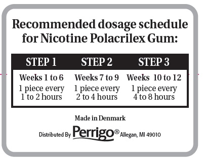 This text provides information regarding the recommended dosage schedule for Nicotine Polacrilex Gum, which is a type of medication used to help individuals quit smoking. The schedule includes three steps to be followed across a period of twelve weeks. Step one involves consuming one piece of gum every 1-2 hours, step two involves consuming one piece every 2-4 hours, and step three involves consuming one piece every 4-8 hours. The product is made in Denmark and is called Issbuteasy Peitizo G, 500.*