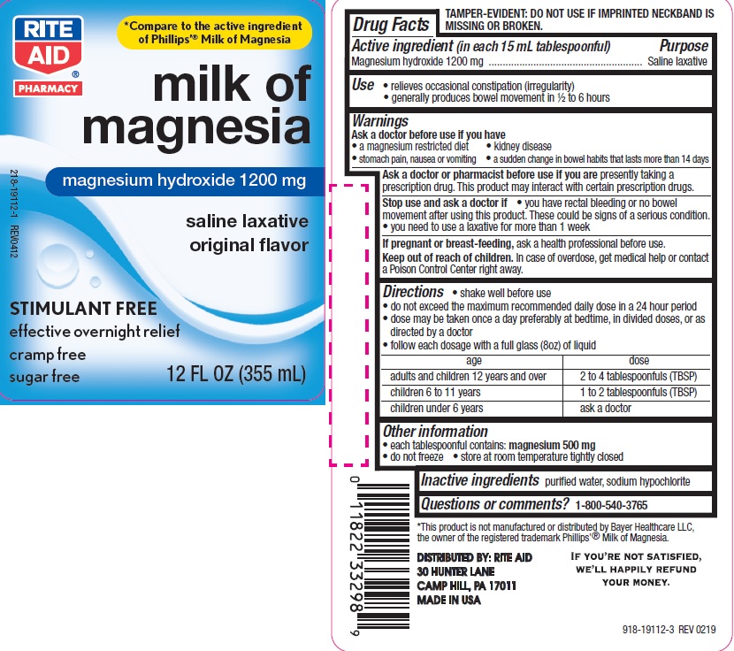 This is a description of a medication that is used as a saline laxative. It contains magnesium hydroxide (1200 mg per 15 mL) that typically produces a bowel movement within 6 hours. The product is tamper-evident and should not be used if the imprinted neckband is missing or broken. The dosage should not exceed the recommended daily amount within a period of 24 hours, and should be followed by a full glass of water (8-10 oz). This medication should be stored at room temperature, and kept out of reach of children. The inactive ingredients are purified water and sodium hypochlorite. If you are pregnant, breastfeeding, or have any stomach pain, you should seek doctor's advice prior to use. Contact a doctor if you experience rectal bleeding or no bowel movement after using this medication. This product is distributed by Rite Aid, and is not manufactured or distributed by Bayer Healthcare LLC.*