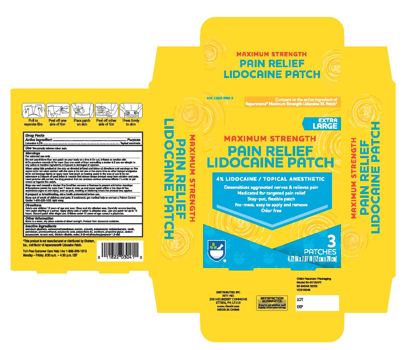 The following image provide visual information about the product associated with Rite Aid Lidocaine Patch Xlarge NDC 11822-9992 by Rite Aid Corporation, such as packaging, labeling, and the appearance of the drug itself. This resource could be helpful for medical professionals, pharmacists, and patients seeking to verify medication information and ensure they have the correct product.