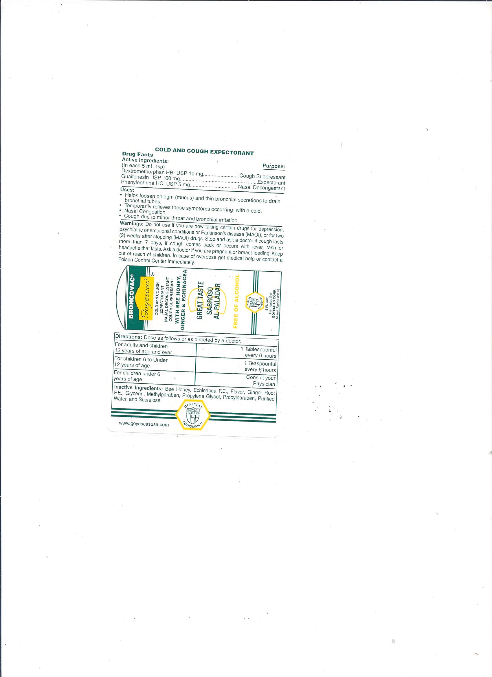 Broncovac is a cough and cold medication containing Dextromethorphan HBr, Guaitenesin, and Phenylephrine HCI. It's used to loosen phlegm and thin bronchial secretions to help with nasal congestion and cough due to minor throat and bronchia irritation. The medication is free of alcohol and contains bee honey, ginger, and echinacea. The dosage and directions depend on age and should be followed as directed by a doctor. It is important to read the warnings before use and keep it out of reach of children. The inactive ingredients include glycerin, purified water, and sucralose. The medication comes in a bottle size of 6 fl. onz. and it is distributed by Goyescas Corp.*