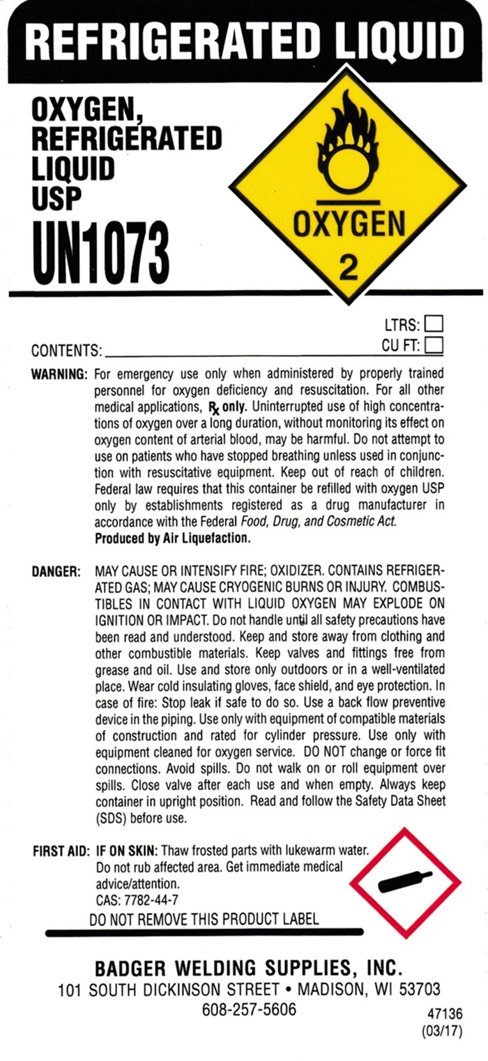 The following 2 images provide visual information about the product associated with Oxygen NDC 12121-001 by Badger Welding Supplies, Inc., such as packaging, labeling, and the appearance of the drug itself. This resource could be helpful for medical professionals, pharmacists, and patients seeking to verify medication information and ensure they have the correct product.
