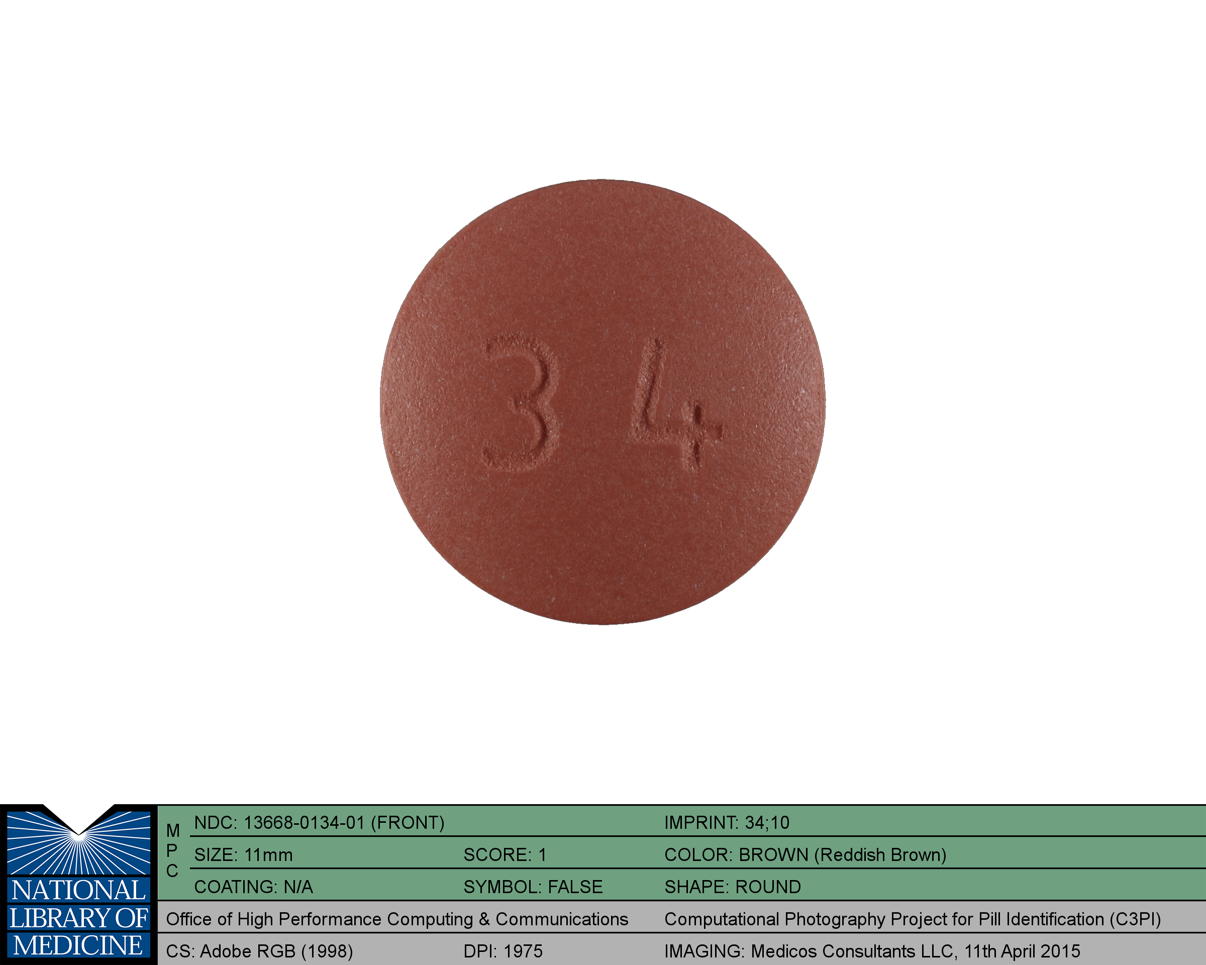 Felodipine by Torrent Pharmaceuticals Limited is a brown round tablet, extended release about 11 mm in size, imprinted with 34 and 10. The product is a human prescription drug with active ingredient(s) felodipine. The shape, size, imprinting and color are characteristics of an oral solid dosage form of a medicinal product.