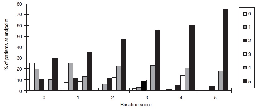 This appears to be a chart or table with various percentages and scores. It includes data points for patients at an endpoint and a baseline score. However, without any additional context, it is not possible to determine what these percentages and scores represent or what they are being used for.*