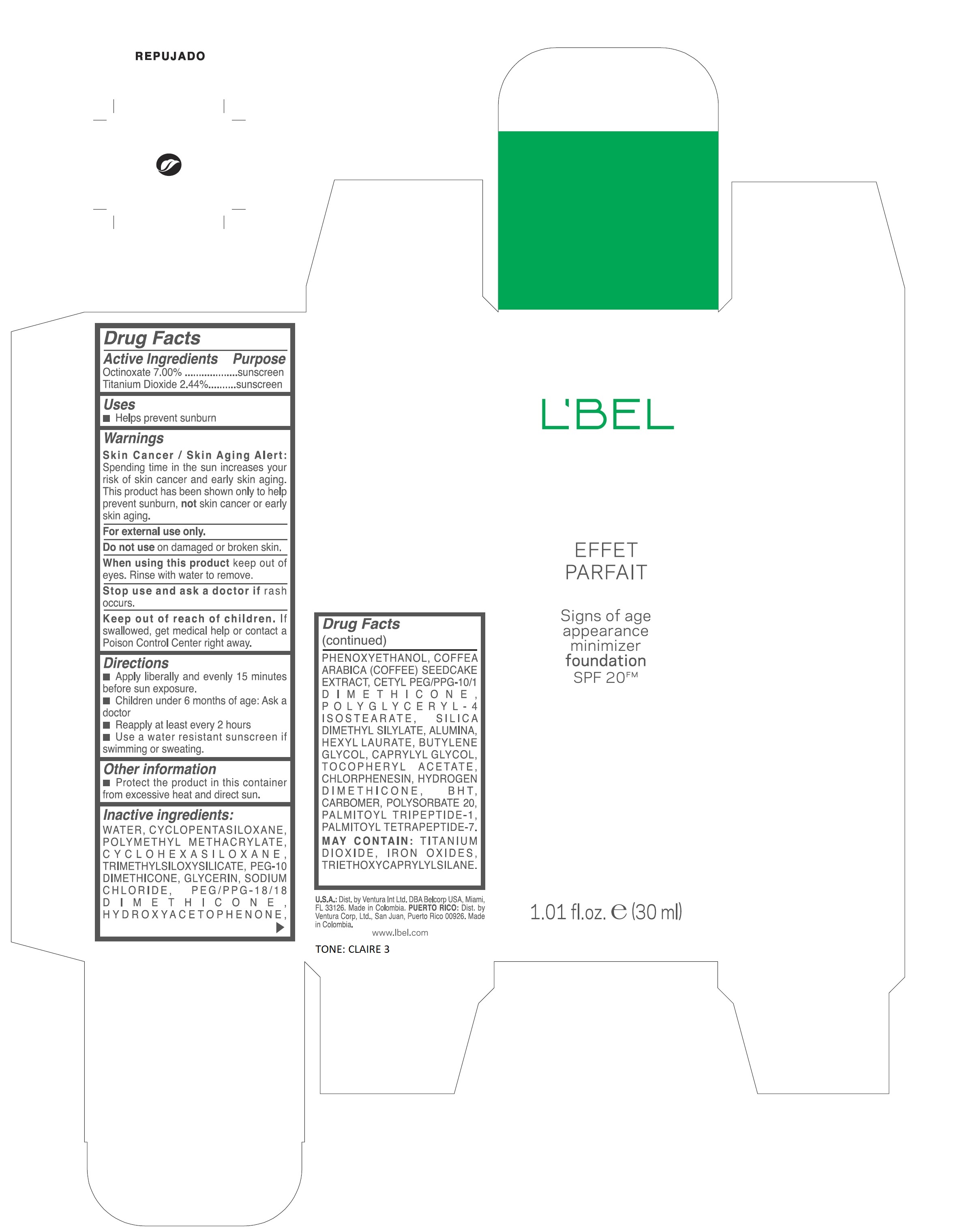 The following 5 images provide visual information about the product associated with Lbel Effet Parfait Signs Of Age Appearance Minimizer Foundation Spf 20 Fm Claire 3 NDC 14783-291 by Ventura International Ltd, such as packaging, labeling, and the appearance of the drug itself. This resource could be helpful for medical professionals, pharmacists, and patients seeking to verify medication information and ensure they have the correct product.