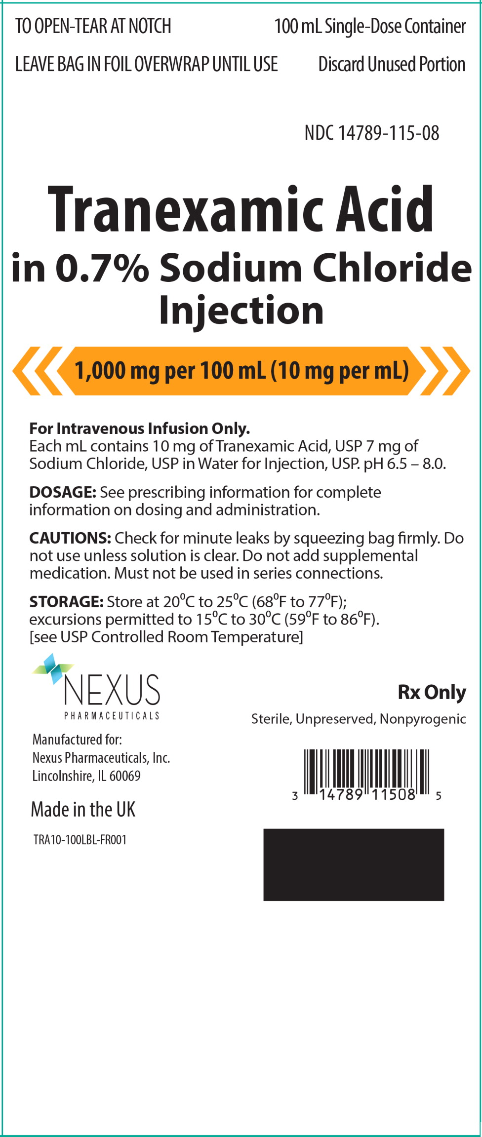 The following 3 images provide visual information about the product associated with Tranexamic Acid NDC 14789-115 by Nexus Pharmaceuticals Llc, such as packaging, labeling, and the appearance of the drug itself. This resource could be helpful for medical professionals, pharmacists, and patients seeking to verify medication information and ensure they have the correct product.