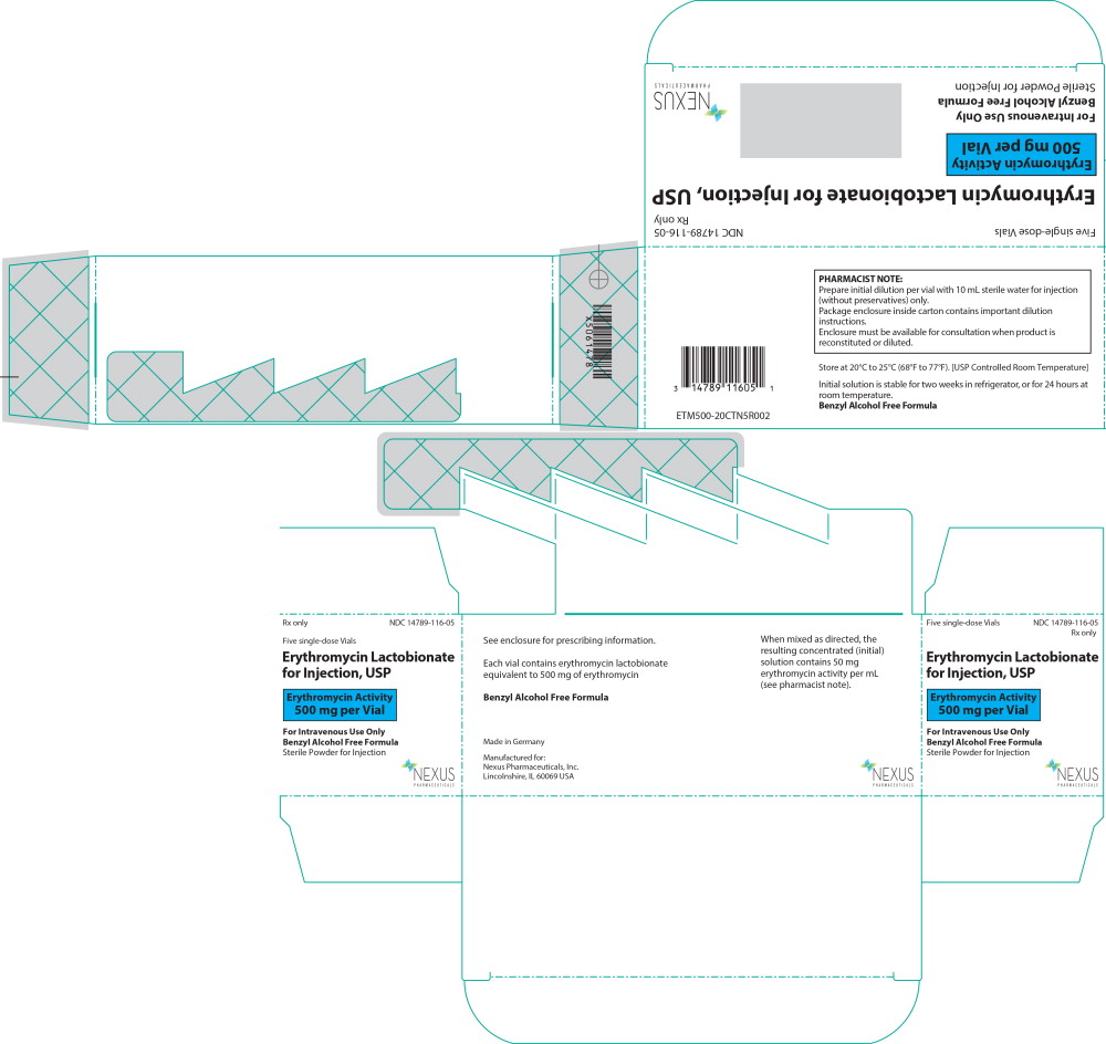 The following 3 images provide visual information about the product associated with Erythromycin Lactobionate NDC 14789-116 by Nexus Pharmaceuticals Llc, such as packaging, labeling, and the appearance of the drug itself. This resource could be helpful for medical professionals, pharmacists, and patients seeking to verify medication information and ensure they have the correct product.