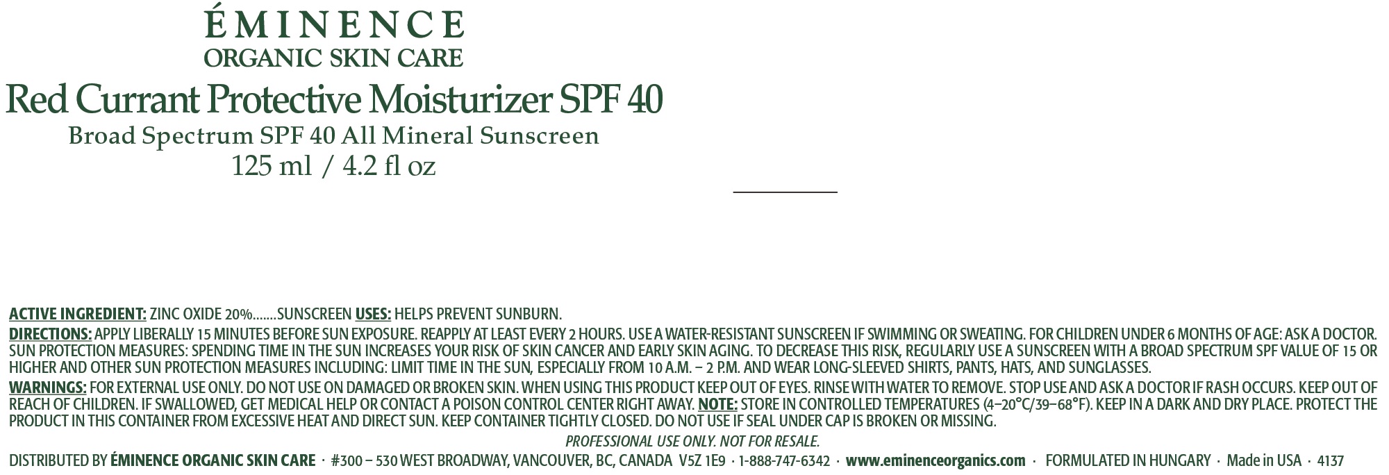 This is a Drug Facts sheet for Red Currant Protective Moisturizer with SPF 40 made by Eminence Organic Skin Care. The product contains a variety of natural and organic ingredients and protects against skin aging and sunburn. The Active Ingredient is Zinc Oxide 20%. The use of the product helps to decrease the risk of skin cancer caused by the sun. The container should be kept in a dark and dry place and protected from excessive heat and direct sun. Store at 4-20°C/39-66°F. The usage and limitations are printed on the label. The product is formulated in Hungary and made in the USA. The Eminence Organic Skin Care company is committed to cruelty-free and sustainable practices. Parabens, Phthalates, Sodium Lauryl Sulphate, Propylene Glycol, and Animal Testing are not used. The product package includes instructions for proper use, warnings, and drug facts.*