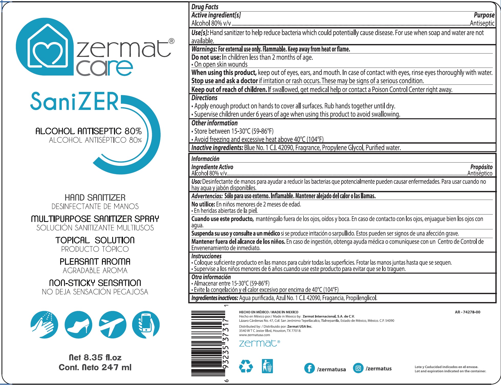 This is a drug facts label for a hand sanitizer with active ingredient Alcohol 80% v/v. The hand sanitizer is used to reduce bacteria that could cause diseases and is for external use only. It warns that the product is flammable and should be kept away from heat or flame. The hand sanitizer should not be used on children less than 2 months of age or on open skin wounds. The user should keep out of eyes, ears, and mouth. If swallowed, medical help should be sought immediately. The inactive ingredients include blue No. 1 Cl. 42090, fragrance, propylene glycol, purified water. The product is manufactured by Zermat International, S.A. de C.V.*