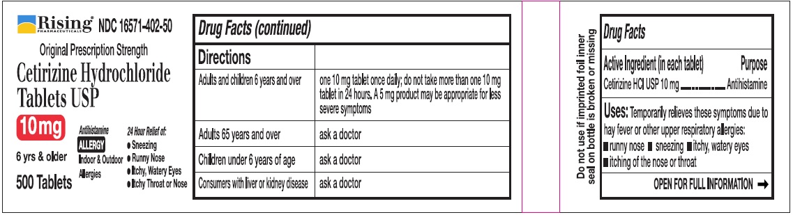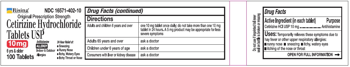 The following 6 images provide visual information about the product associated with Cetirizine Hydrochloride NDC 16571-402 by Rising Pharma Holdings, Inc., such as packaging, labeling, and the appearance of the drug itself. This resource could be helpful for medical professionals, pharmacists, and patients seeking to verify medication information and ensure they have the correct product.