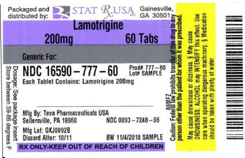 This is a description of a medication named Lamotrigine 200mg, which is packaged and distributed by Teva Pharmaceuticals USA. Each tablet contains 200mg of Lamotrigine. The NDC number for the medication is 16590-777-60. The medication is RX only, so it should be kept out of reach of children.*