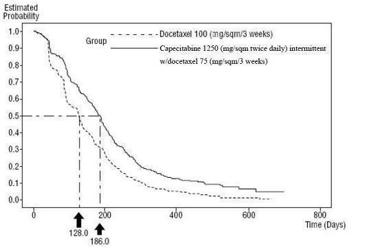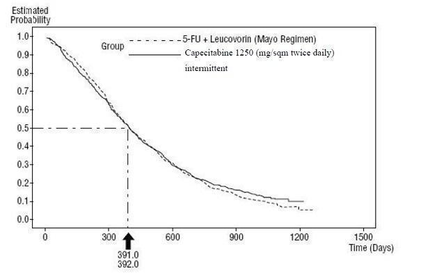 This text appears to be a chart or table with a list of estimated probabilities ranging from 0.0 to 10, and refers to the use of two cancer treatments, "5-FU + Leucovorin (Mayo Regimen)" and "Capecitabine 1250 (mg/sqm e daily)", administered intermittently over a period of days. The numbers 600, 900, 1200, and 1500 are likely time intervals.*
