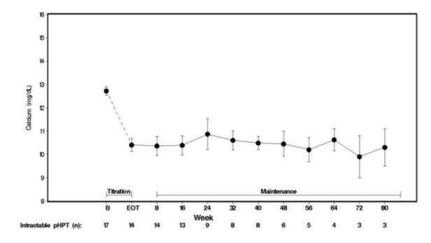 Seventeen patients entered the study. The median exposure to cinacalcet was 270 days (range: 32 to 1,105). At baseline the mean (SE) serum calcium was 12.7 (0.2) mg/dL. At the end of the titration phase the mean (SE) serum calcium was 10.4 (0.3) mg/dL, which is a mean reduction of 2.3 (0.3) mg/dL from baseline. Figure 4 illustrates mean serum calcium (mg/dL) over time for all patients still on study at each time point from the beginning of titration to study visit week 80. Daily dose during the study ranged from 30 mg twice a day to 90 mg four times a day.