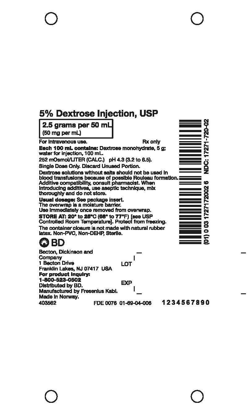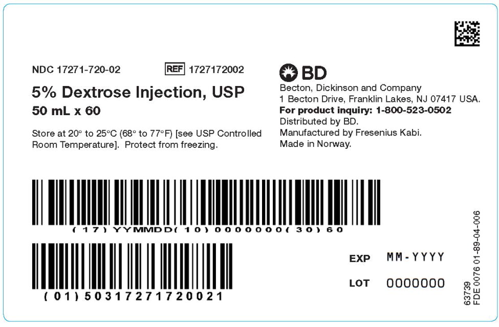 This is a description of a pharmaceutical product, specifically 5% Dextrose Injection USP. The product comes in a container of 50 mL and there are 60 containers in a package. It should be stored within the temperature range of 20°C to 25°C to prevent it from freezing. The manufacturer is Fresenius Kabi, made in Norway, and is distributed by BD. The product has a lot number, but the expiry date is not provided. The text includes various codes and references such as NDC 17271-720-02 and the contact information of the manufacturer.*
