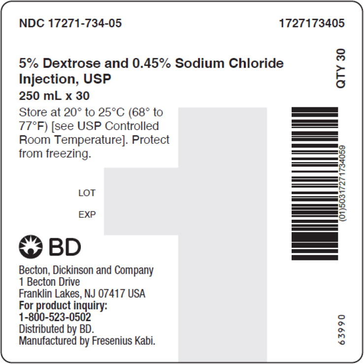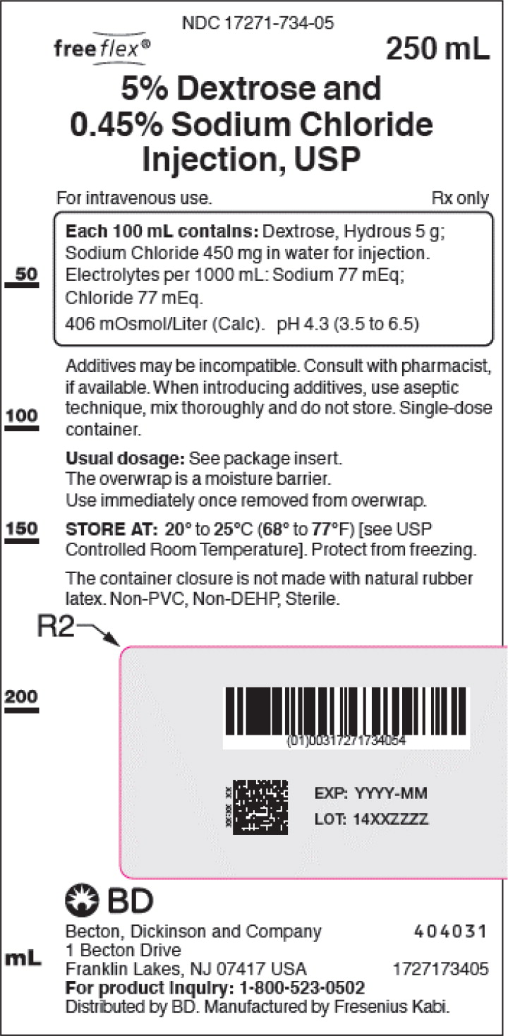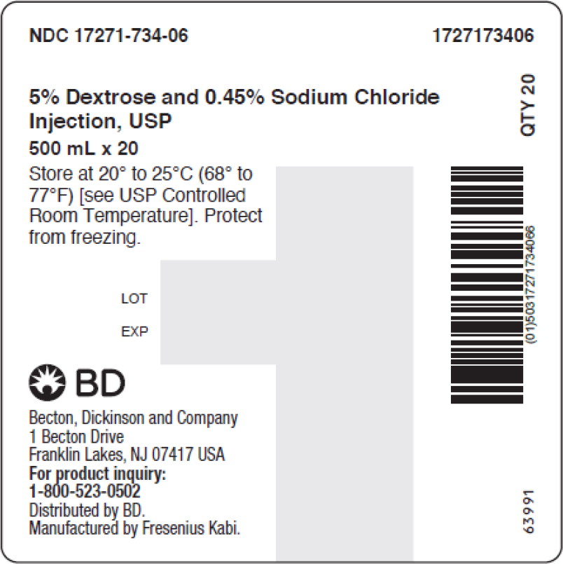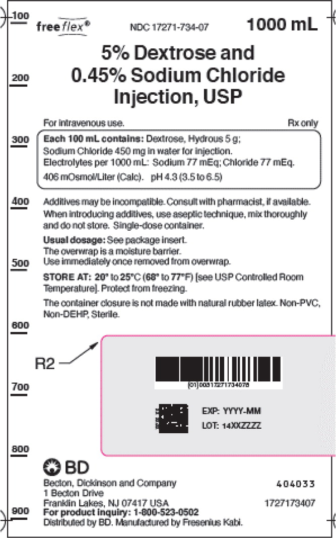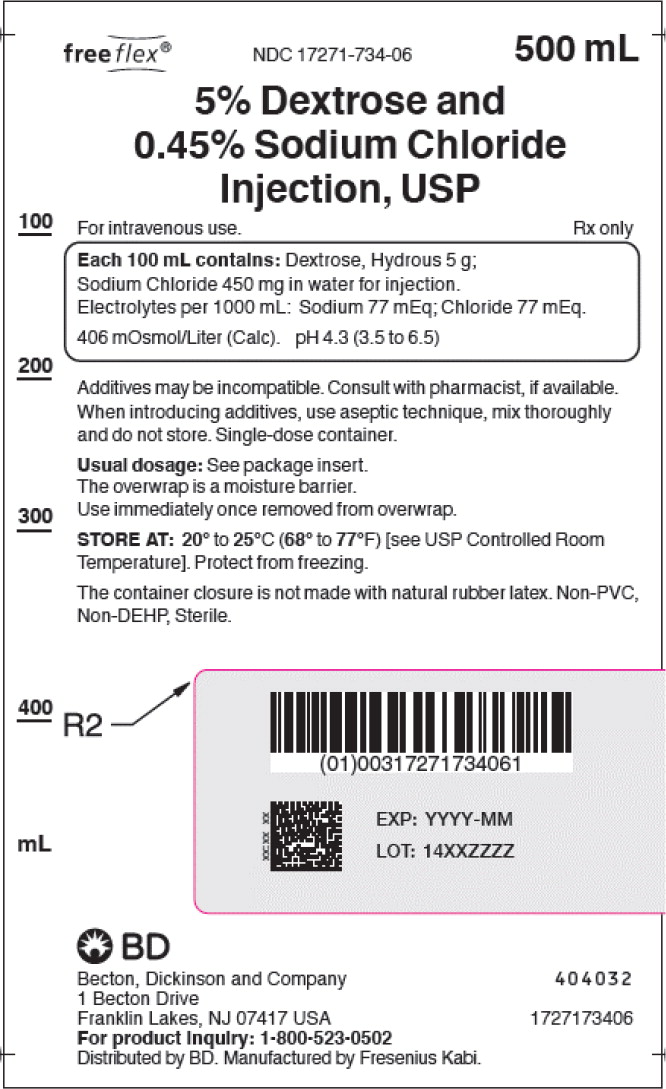 This text provides information about a medical product called freeflex® NDC 17271-734-06 in 500 mL volume, which is a solution containing 5% Dextrose and 0.45% Sodium Chloride for intravenous use. It details the composition, electrolytes content, osmolality, and pH of the solution. The text also includes instructions on storage, usage, compatibility with additives, and dosage recommendations. Additionally, it mentions the manufacturer as Becton, Dickinson and Company, with distribution by BD and manufacture by Fresenius Kabi. Potential users are urged to consult a pharmacist for compatibility with additives when using the product.*
