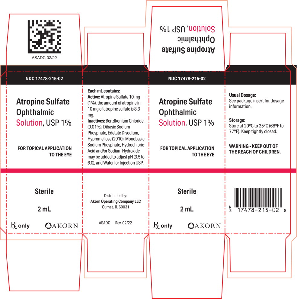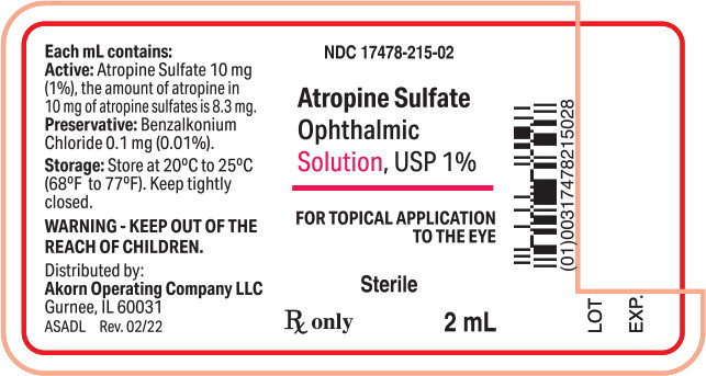This is a description of a medication with active ingredient Atropine Sulfate, with 10 mg per mL concentration. It comes in a 2 mL container with NDC number 17478-215-02. It has a preservative, Benzalkonium Chloride, at a concentration of 0.1 mg per mL. It is an ophthalmic solution with USP 1% concentration. The medication should be stored at 20°C to 25°C (68°F to 77°F) and should be kept tightly sealed. The medication is intended for topical application only and should be kept out of reach of children. The medication is sterile and distributed by Akorn Operating Company LLC. The text includes a reference to a warning, but no specific details are provided. No information about the medication's indications or usage is included.*