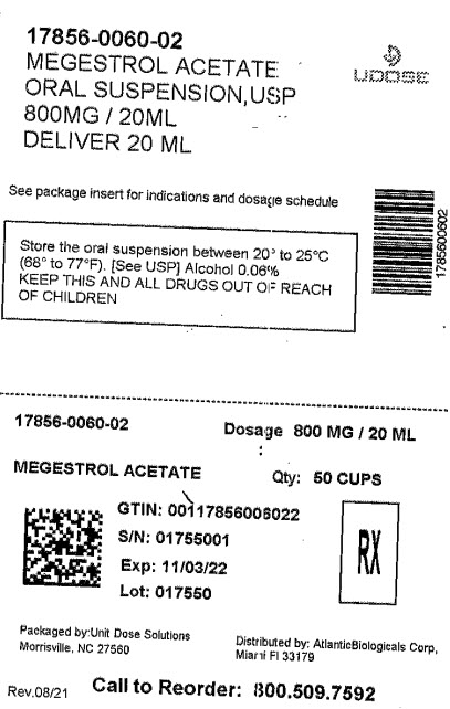 The following 5 images provide visual information about the product associated with Megestrol Acetate NDC 17856-0060 by Atlantic Biologicals Corp., such as packaging, labeling, and the appearance of the drug itself. This resource could be helpful for medical professionals, pharmacists, and patients seeking to verify medication information and ensure they have the correct product.
