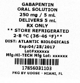 This is a description of a prescription drug, Gabapentin. It is an oral solution of 250mg / S mL, where each delivery is 5mL. The medication requires refrigeration with a temperature specification of 2-8 °C (36-46 °F). The drug has been distributed by Atlantic Biologics with an expiration date of 04/25/2017 and the lot number is o0000. The manufacturing lot number is xxxxx, and the medication was packaged by UDOSE in Miami, FL.*