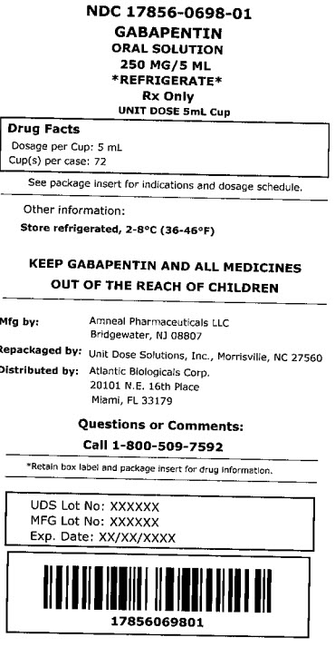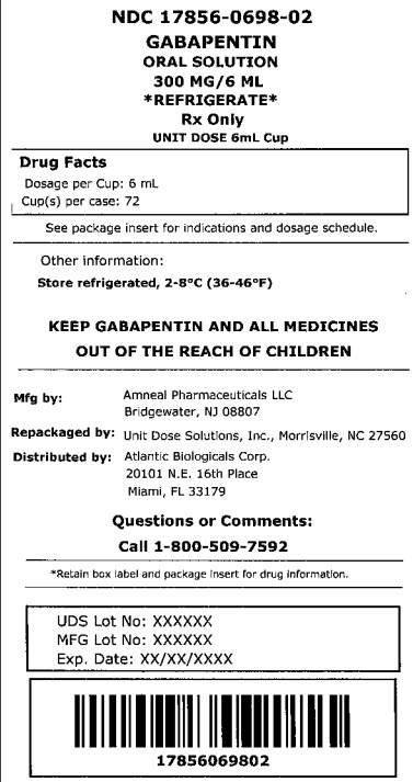 The following 8 images provide visual information about the product associated with Gabapentin NDC 17856-0698 by Atlantic Biologicals Corp., such as packaging, labeling, and the appearance of the drug itself. This resource could be helpful for medical professionals, pharmacists, and patients seeking to verify medication information and ensure they have the correct product.
