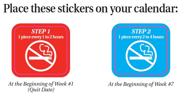 This is a set of instructions that includes stickers to put on a calendar. The sticker says "STEP 3" and advises taking "1 piece every 4 to 8 hours" for an ex-smoker. It also indicates the beginning of week #10, which is 12 weeks after the quit date.*