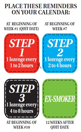 This text appears to be a reminder to place specific events in a calendar related to quitting smoking. The events include taking 1 lozenge every 1 to 2 hours during the first week and every 2 to 4 hours during the third step after quitting. For ex-smokers, it suggests taking 1 lozenge every 4 to 8 hours. Another event is 12 weeks after quitting, but the purpose is not specified.*