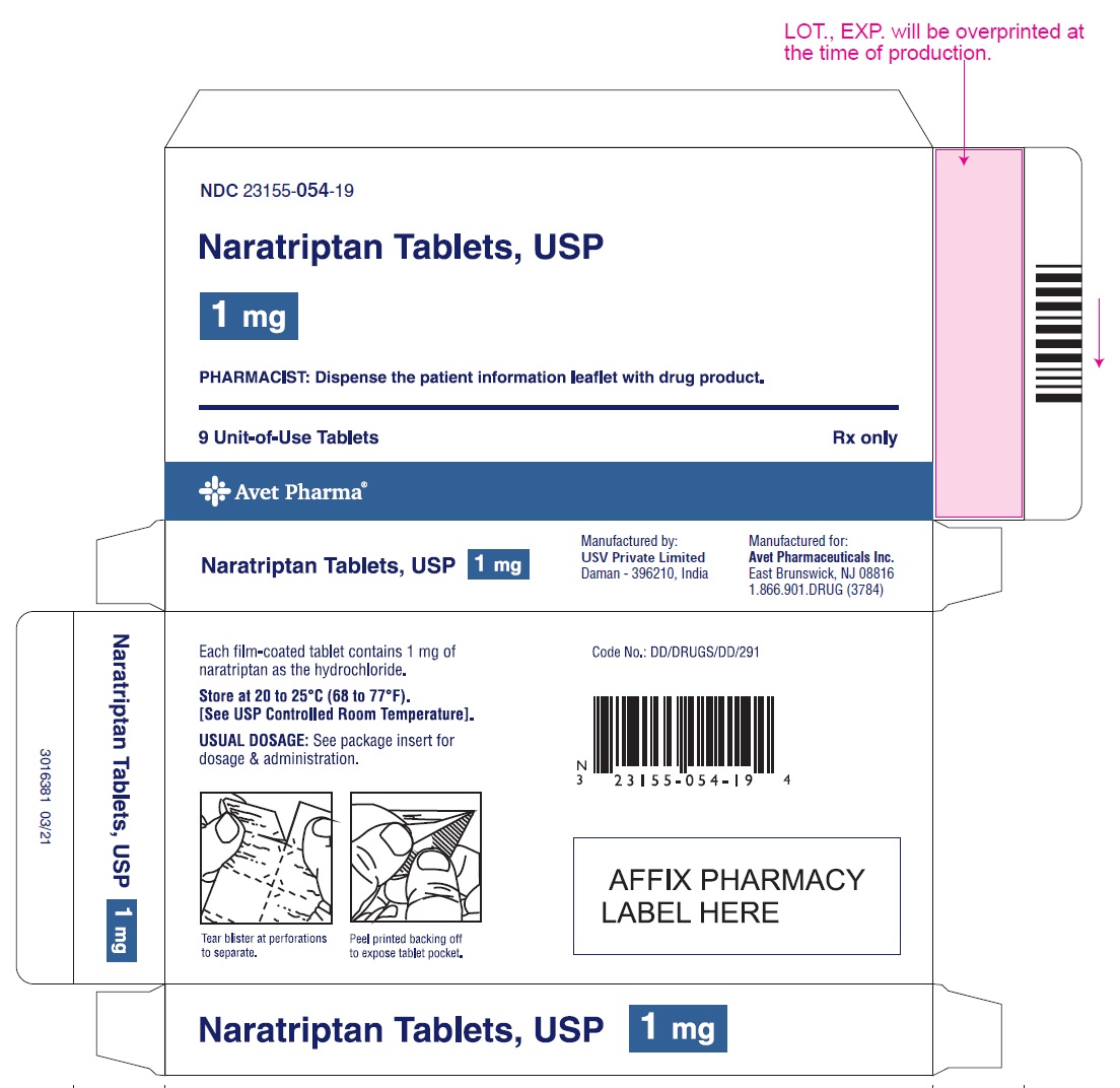 This is a description of a medication named Naratriptan Tablets, USP. The tablets are manufactured by USV Private Limited, Daman, India, and distributed by Avet Pharmaceuticals Inc., East Brunswick, NJ, USA. The tablets contain 1 mg of naratriptan hydrochloride and are supplied in packs that contain 9 unit-of-use tablets. The National Drug Code (NDC) for this product is 23155-054-19. This medication is available only with a doctor's prescription, and the pharmacist should also provide the patient with a leaflet containing the drug's information. The tablets should be stored at 20 to 25°C (68 to 77°F). There are no spelling errors or any other issues of readability.*