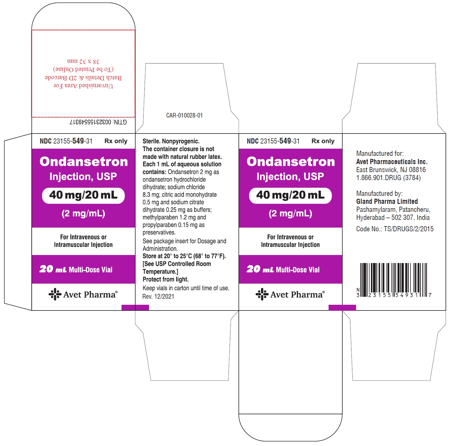 This is a description of a medication with the NDC 23155-549-31 code used only under prescription. The medication is administered by intravenous or intramuscular injection and comes in a 20mL multi-dose vial with 40mg/20mL of Ondansetron. The manufacturer is Avet Pharma and it is marked as nonpyrogenic. The package insert should provide instructions on dosage and administration. The medication contains buffers and preservatives. The lot number of the medication is stated as "2 Lot" and there is a warning indicating that the area should be unvarnished. The other details available include the name and address of the manufacturer, the product code, and a revision date of Dec 2021.*