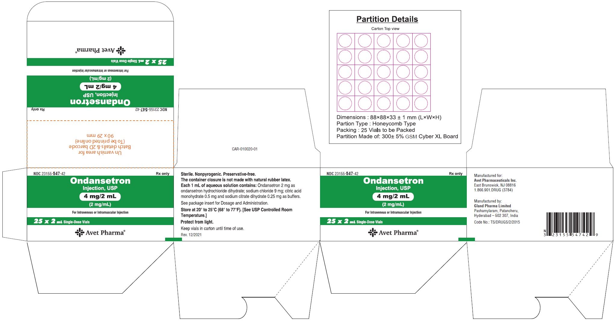 This is a detailed description of a medication, Ondansetron Injection. It comes in a container that contains 25 single-dose vials, and each vial has a solution of 4 mg/2 mL of Ondansetron. It can be administered through Intravenous or Inramuscular jection. The solution is packed with a Honeycomb Type partition made of 300 5% GSM Cyber XL Board. The package insert contains all the instructions on the Dosage and Administration of this medication. Additionally, it is sterile, nonpyrogenic, and preservative-free. It is also stated that the container closure is free from natural rubber latex. It must be kept at a Controlled Room Temperature of 20° to 25°C (68° to 77°F) and protected from light. The medication is manufactured by Gland Pharma Limited and Avet Pharmaceuticals Inc., located in East Brunswick, NJ.*