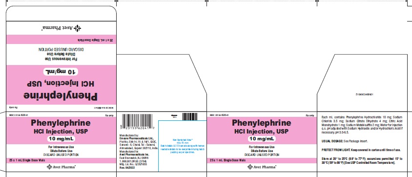 This is a description of Phenylephrine HCI Injection, USP, with a concentration of 10 mg/mL. It comes in a 1 mL Single Dose Vial and is for intravenous use after dilution. The unused portion needs to be discarded, and it should be protected from light. This drug is manufactured by Emcure Pharmaceuticals Ltd. in Sanand, Ahmedabad, India, for Avet Pharmaceuticals Inc. in East Brunswick, NJ. Mig. Lic. No. is G/28/1655, and the lot number and expiration date are not available. It is a prescription-only medicine.*