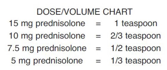 This is a dose/volume chart for prednisolone, a medication commonly used to treat various conditions. It provides the corresponding volume in teaspoons for different doses of prednisolone, ranging from 5 mg to 15 mg. This chart can be useful for accurately measuring and administering the correct dosage of prednisolone to patients.*