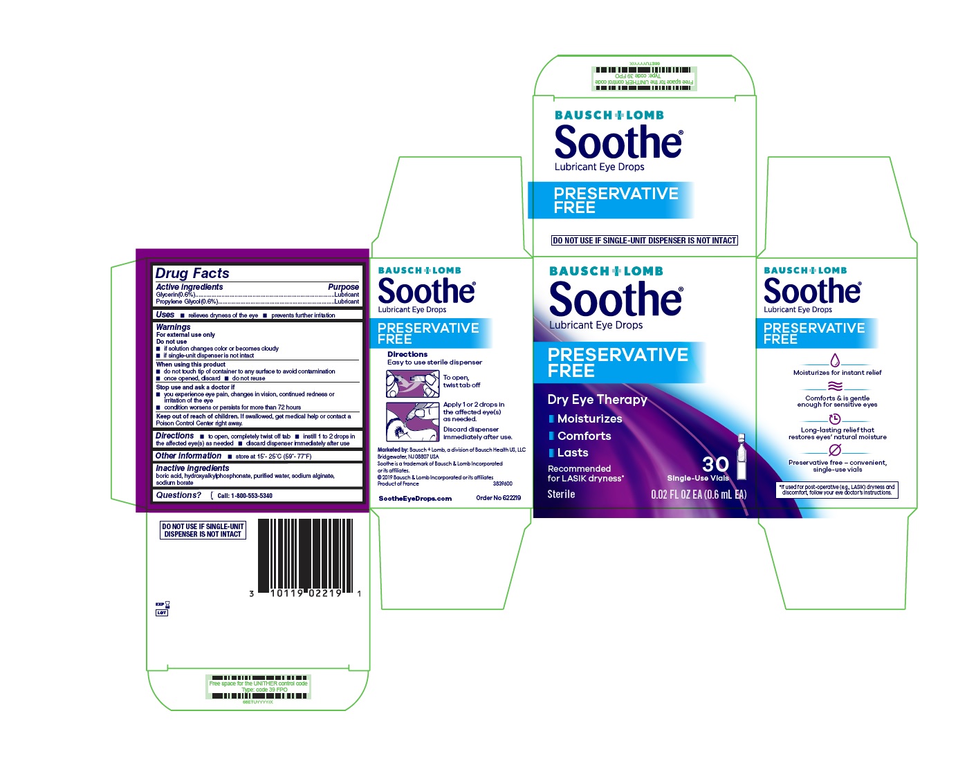 This is a Drug Facts label for BAUSCH+LOMB Soothe Lubricant Eye Drops in preservative-free single-use vials. The active ingredients are Pur and Propyins Gt 5] Libteant for relief of dry eyes. The inactive ingredients include ok, hydsyalyphosphonats, and prfed vl sedum agsta Sb. The product comes in single-use vials with easy-to-use twist-off tops and should be discarded immediately after use. These eye drops moisturize and restore natural moisture to the eyes. The label warns not to use the product if the single-unit dispenser is not intact.*