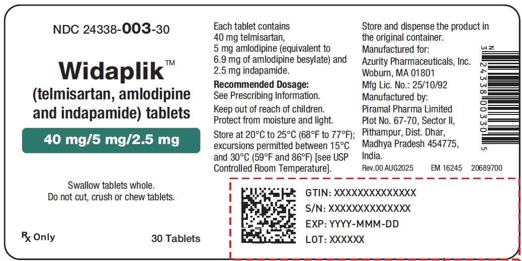 This text provides information about a medication called Widaplik, which is a combination tablet containing telmisartan, amlodipine, and indapamide in specific dosages. The recommended dosage instructions, storage conditions, and manufacturer details are also included. It is important to swallow the tablets whole and keep them out of reach of children, protected from moisture and light. The manufacturer is Aurity Pharmaceuticals, Inc. and the tablets are manufactured by Piramal Pharma Limited in India.*