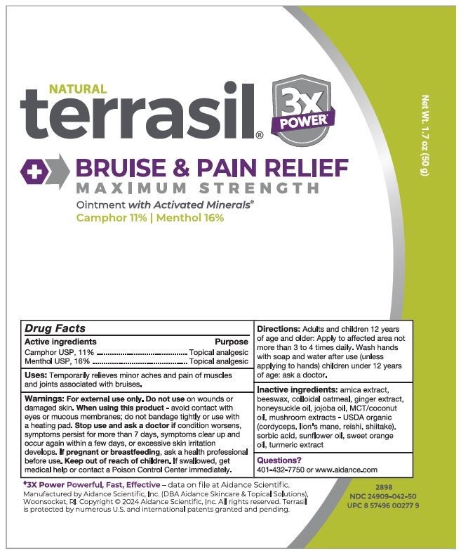 The following image provide visual information about the product associated with Terrasil Bruise And Pain Relief Maximum Strength NDC 24909-042 by Aidance Scientific, Inc., Dba Aidance Skincare & Topical Solutions, such as packaging, labeling, and the appearance of the drug itself. This resource could be helpful for medical professionals, pharmacists, and patients seeking to verify medication information and ensure they have the correct product.