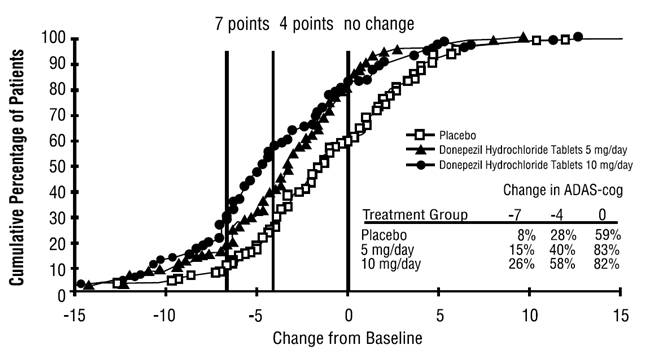 This is a chart that shows the cumulative percentage of patients who experienced a change in their ADAS-cog scores (a measure of cognitive function) after taking different doses of donepezil hydrochloride tablets (5 mg/day and 10 mg/day) or a placebo. The chart also shows the percentage of patients who experienced no change in their scores. The x-axis shows the change in ADAS-cog scores from baseline and the y-axis shows the cumulative percentage of patients.*