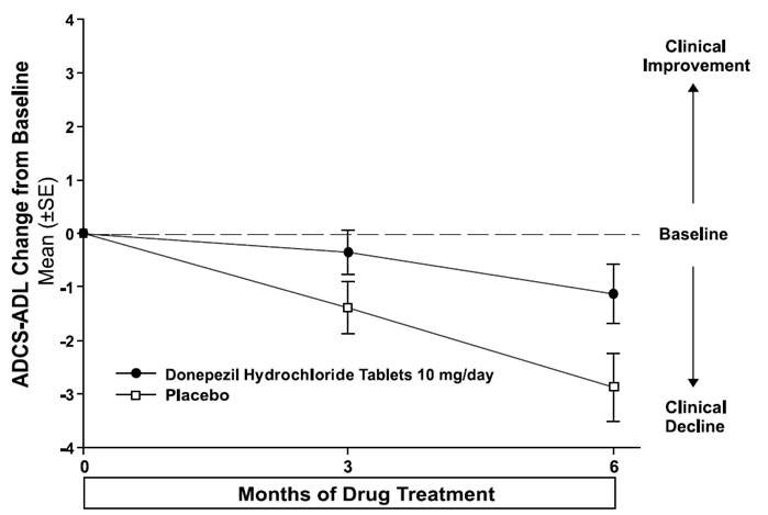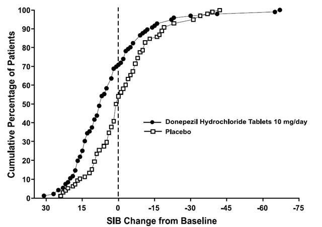 This is a comparison of the mean change from baseline in SIB scores for patients taking Donepezil Hydrochloride Tablets 10 mg/day versus placebo. The chart also indicates the level of clinical improvement and the duration of drug treatment (3 months).*