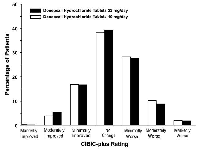 This is a chart showing the percentage of patients who took either Donepezil Hydrochloride Tablets 10mg/day, Donepezil Hydrochloride Tablets 5mg/day, or placebo. It also shows the CIBIC-plus Rating of the patients, with options ranging from markedly improved to markedly worse. No further context or information is given.*