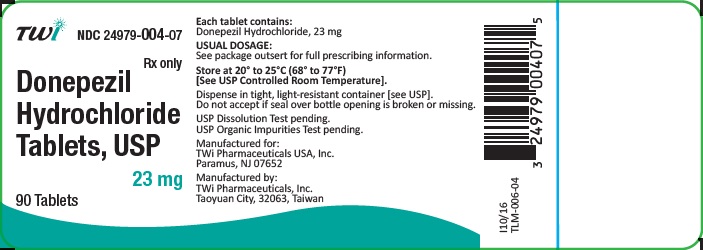 Donepezil is a medication available in a bottle containing 90 tablets of hydrochloride. Each tablet contains 23mg of an active ingredient. The medication information and prescription details can be found on the packaging. It is recommended to store the tablets in a tamper-resistant, light-resistant container at room temperature. To ensure the effectiveness of the medication, dissolve the tablet and conduct a USP dissolution test. The company address is located in Paramus, NJ 07652 with another mention of an address in Taoyuan City 32063, Taiwan.*
