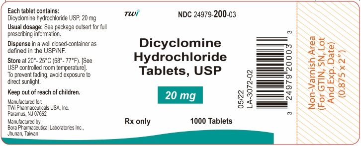 The following 3 images provide visual information about the product associated with Dicyclomine Hydrochloride NDC 24979-200 by Twi Pharmaceuticals, Inc., such as packaging, labeling, and the appearance of the drug itself. This resource could be helpful for medical professionals, pharmacists, and patients seeking to verify medication information and ensure they have the correct product.
