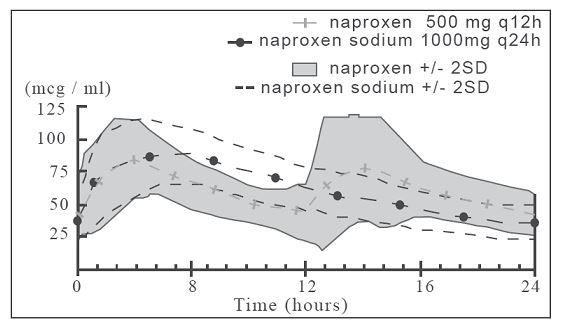 Food EffectsNo significant food effects were observed when twenty-four subjects were given a single dose of Naproxen Sodium Controlled-Release Tablets 500 mg either after an overnight fast or 30 minutes after a meal. In common with conventional naproxen and naproxen sodium formulations, food causes a slight decrease in the rate of naproxen absorption following Naproxen Sodium Controlled-Release Tablets administration.
