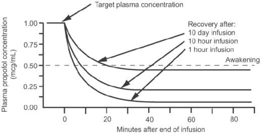 By daily titration of propofol injectable emulsion dosage to achieve only the minimum effective therapeutic concentration, rapid awakening within 10 minutes to 15 minutes can occur even after long-term administration. If, however, higher than necessary infusion levels have been maintained for a long time, propofol redistribution from fat and muscle to the plasma can be significant and slow recovery.