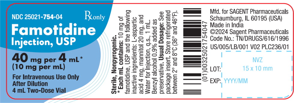 Description: This is a Famotidine Injection, USP with the NDC number 25021-753-02. Manufactured for SAGENT Pharmaceuticals in Schaumburg, IL, USA, and made in India. The product comes in a 2 mL Single-Dose Vial with a specific code number. Dosage instructions and other details are provided on the package insert.*