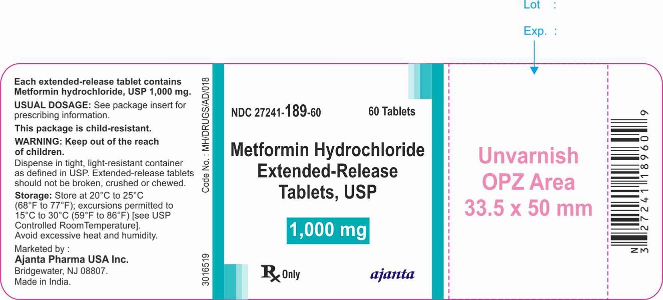 This is a description of a medication called Metformin Hydrochloride in a 1,000mg extended-release tablet form. The usual dosage information is available on the package insert. The medication should be kept out of reach of children and dispensed in a child-resistant, light-resistant container. The tablet should not be broken, crushed or chewed. The medication should be stored at 20°C to 25°C (68°F to 77°F) with excursions permitted to 15°C to 30°C (59°F to 86°F). Excessive heat and humidity should be avoided. This medication is marketed by Ajanta Pharma USA Inc. and made in India. The NDC number for this medication is 27241-189-60, and it is available in a package of 60 tablets.*