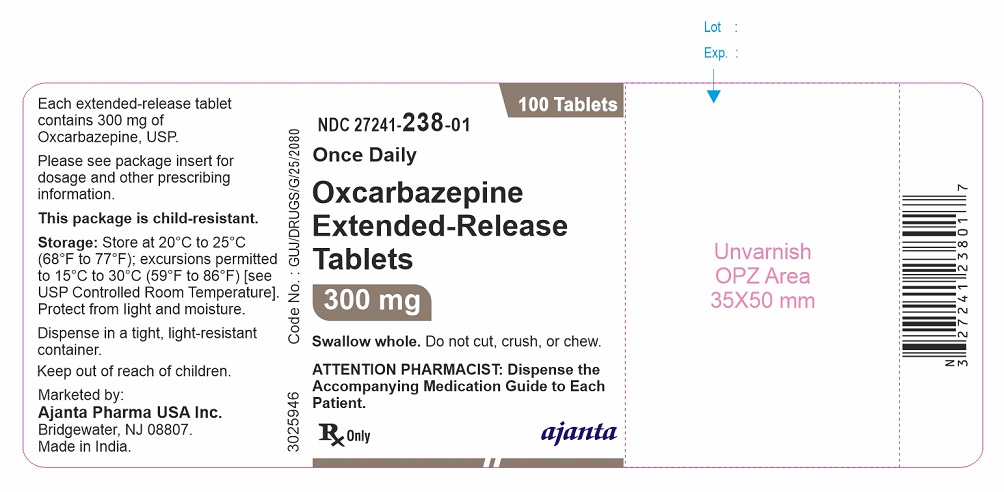 The following 4 images provide visual information about the product associated with Oxcarbazepine NDC 27241-238 by Ajanta Pharma Usa Inc., such as packaging, labeling, and the appearance of the drug itself. This resource could be helpful for medical professionals, pharmacists, and patients seeking to verify medication information and ensure they have the correct product.