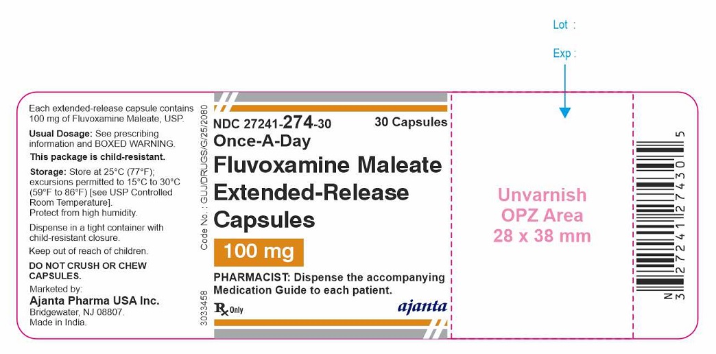 This text provides information about an extended-release capsule containing 100 mg of Fluvoxamine Maleate, USP. It includes details about dosage, storage instructions, child-resistant packaging, warnings, and manufacturer information. The medication should be stored at a specific temperature and protected from high humidity. It is advised not to crush or chew the capsules. The product is marketed by Ajanta Pharma USA Inc. and made in India. The package contains 30 capsules for once-a-day use. Pharmacists are instructed to dispense a Medication Guide to each patient along with the product.*