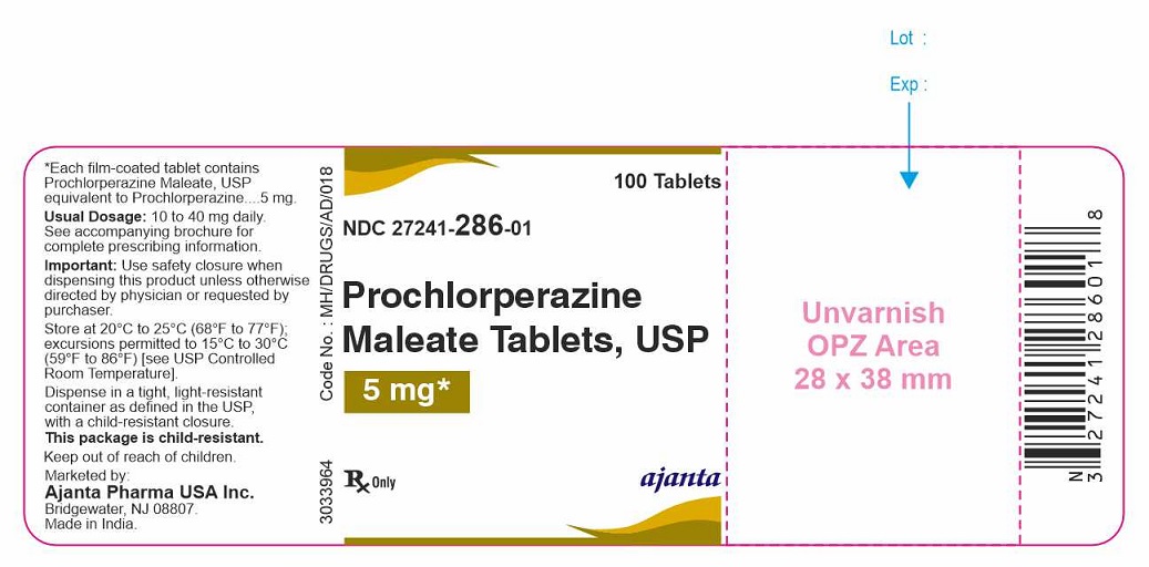 This is a description of Prochlorperazine Maleate tablets containing 5 mg each. The usual dosage range is 10 to 40 mg per day. The tablets should be stored at 20°C to 25°C (68°F to 77°F) with excursions permitted between 15°C to 30°C (59°F to 86°F). Dispensing should be done in a tight, light-resistant container with a child-resistant closure. The package is child-resistant. The tablets are manufactured by Ajanta Pharma USA Inc. in India.*