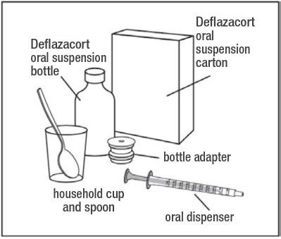 This text describes a package containing Deflazacort oral suspension in a carton along with a bottle, bottle adapter, and a household cup for dispensing the medication orally.*