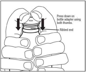 This text provides instructions on how to use a bottle adapter. It states to press down on the adapter using both thumbs. This simple and clear description guides the user on how to use the product effectively.*
