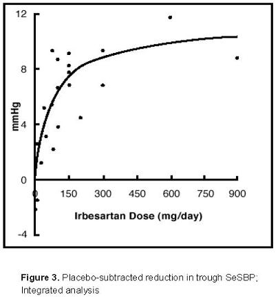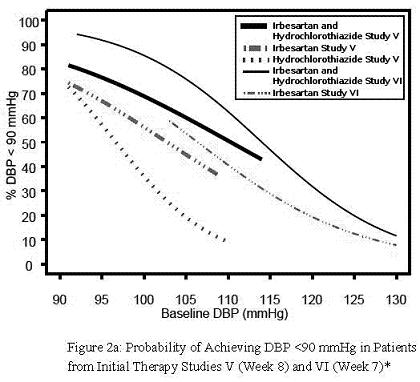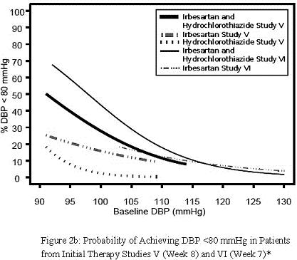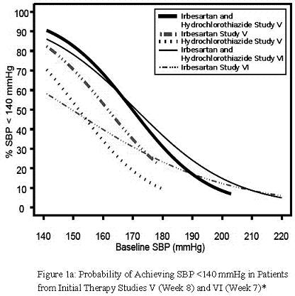 This appears to be a description of a study involving the use of Irbesartan and Hydrochlorothiazide for patients with high blood pressure. Figure 1b displays the probability of patients achieving a systolic blood pressure reading of under 130 mmHg after 8 weeks of therapy. However, no further information is available.*
